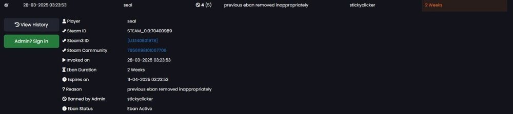 1: My ingame name: seal 2: My SteamID: STEAM_1:0:70400989 3: Name of the admin(s) involved: stickyclicker 4: What server did it happen on: ze 5: Map: idk 6: Time and date: today 7: Explanation of the situation: got 2 weeks eban for doing nothing. it says because previous eban removed inappropriately. even tho i didnt ask any admin to remove my eban and when it was removed it was only 4 hours left. i dont get it why i need to be eban again especially 2 weeks 8: Proof:
